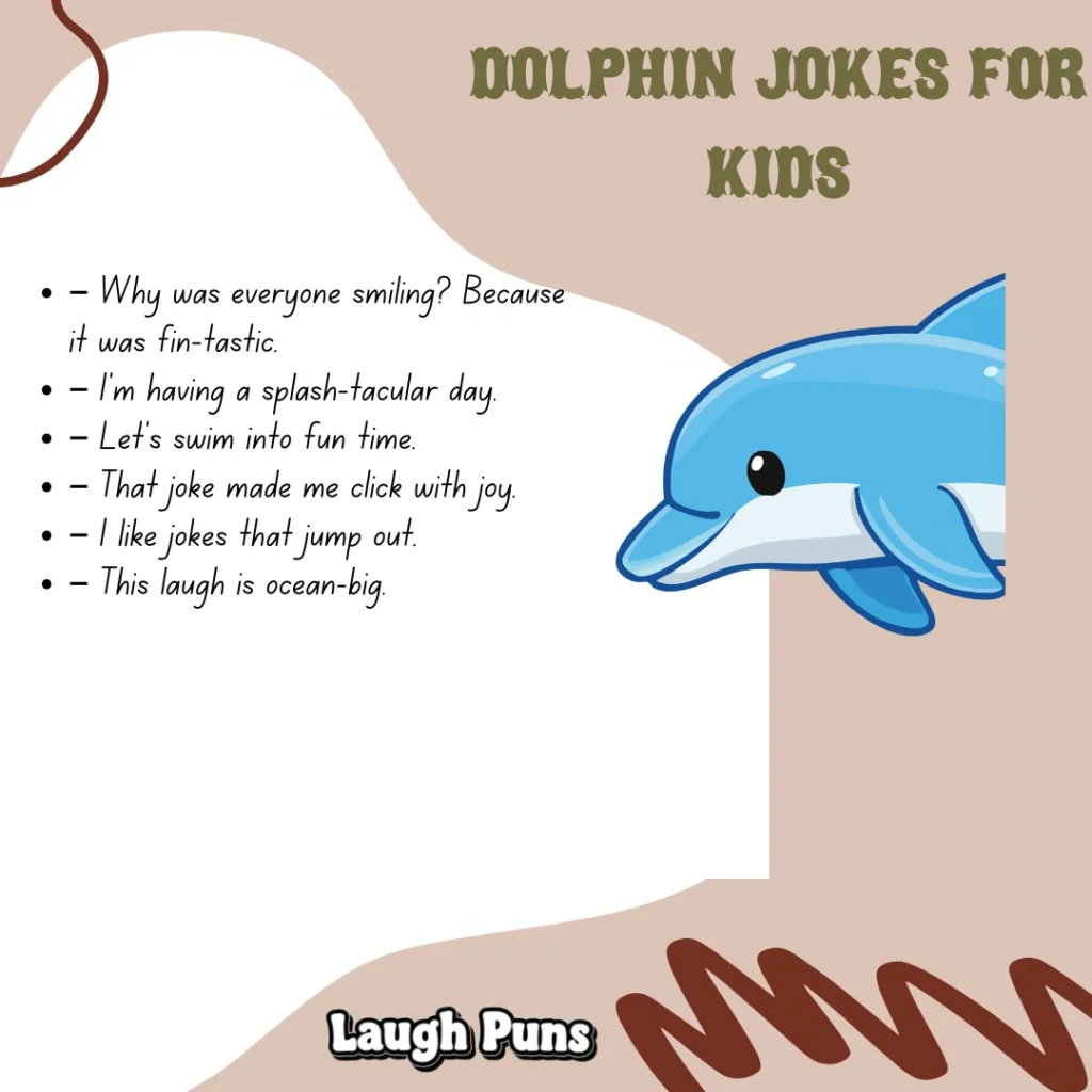 Dolphin jokes bring bright, playful humor inspired by one of the ocean’s most joyful creatures. With their friendly nature and clever antics, dolphins make the perfect subject for light, splashy wordplay. These jokes glide in with easy smiles and breezy charm, offering a fun dose of seaworthy laughter.