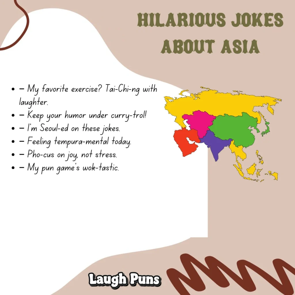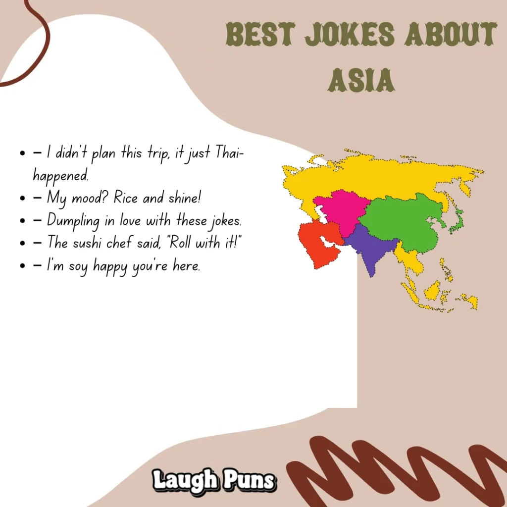 Asia’s full of color, culture, and character—and just as full of reasons to laugh. These jokes celebrate its quirks, flavors, and endless charm with a light, playful touch.
