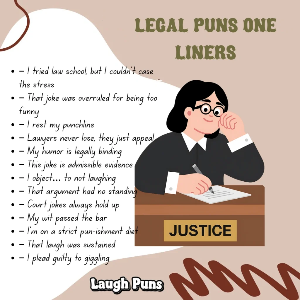 Legal puns turn the world of courts, cases, and law into clever, lighthearted humor. These witty lines bring a playful twist to serious terminology, creating jokes that feel smart, sharp, and surprisingly fun.