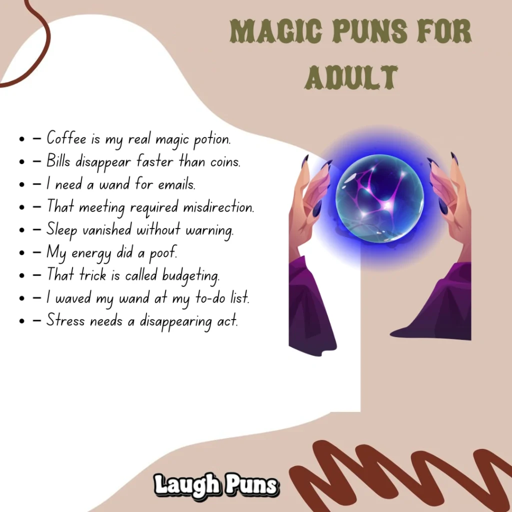 Magic puns remind us that laughter can feel like its own little spell. With their sparkling charm and imaginative twists, they bring delight that appears instantly.