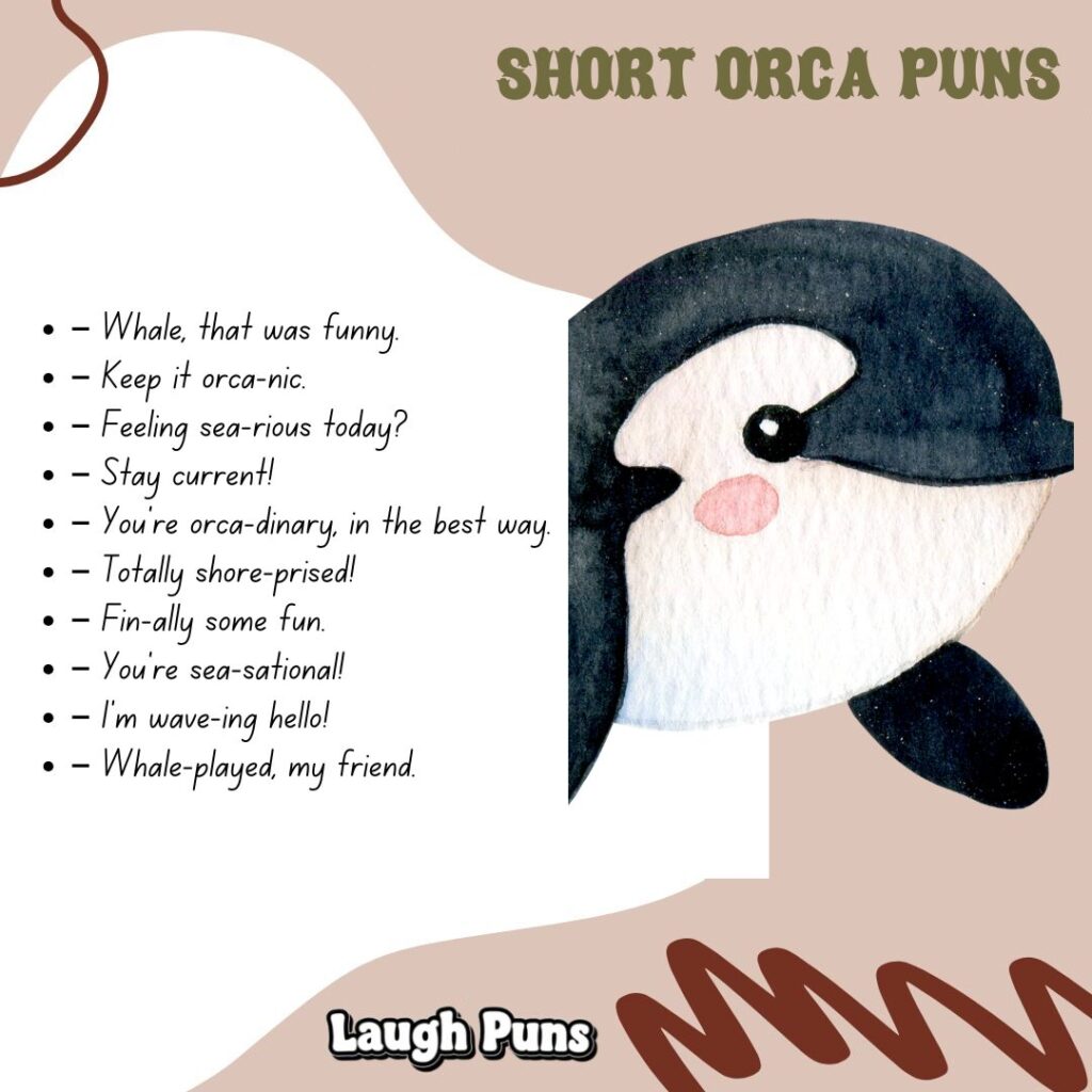 Orca puns surface with power and playfulness. They’re grand but grounded, echoing laughter that rolls like the tide—big, beautiful, and impossible to ignore.