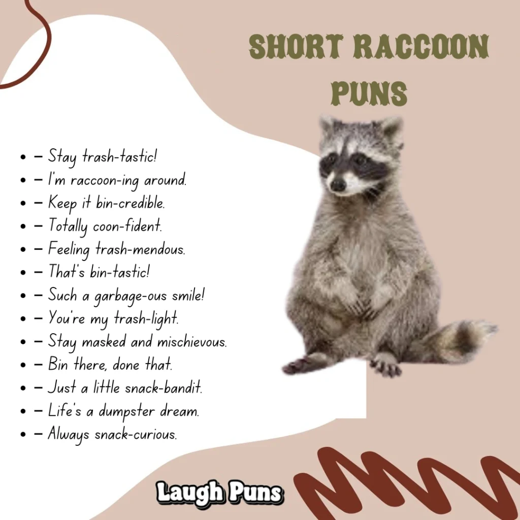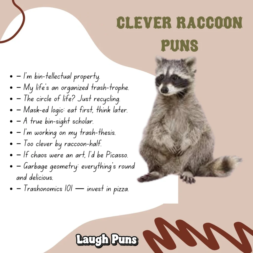 Raccoon puns scavenge laughs from the strangest places and still come out shining. They’re scrappy, quick, and a little unpredictable—the kind of humor that thrives in the dark but always steals the spotlight.