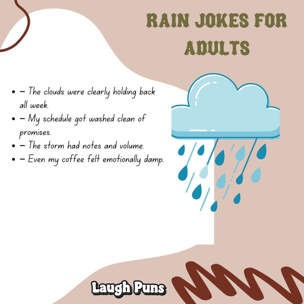 Rain jokes prove that laughter is the best kind of umbrella. Quick, witty, and a little splashy—they always make gray skies feel brighter.