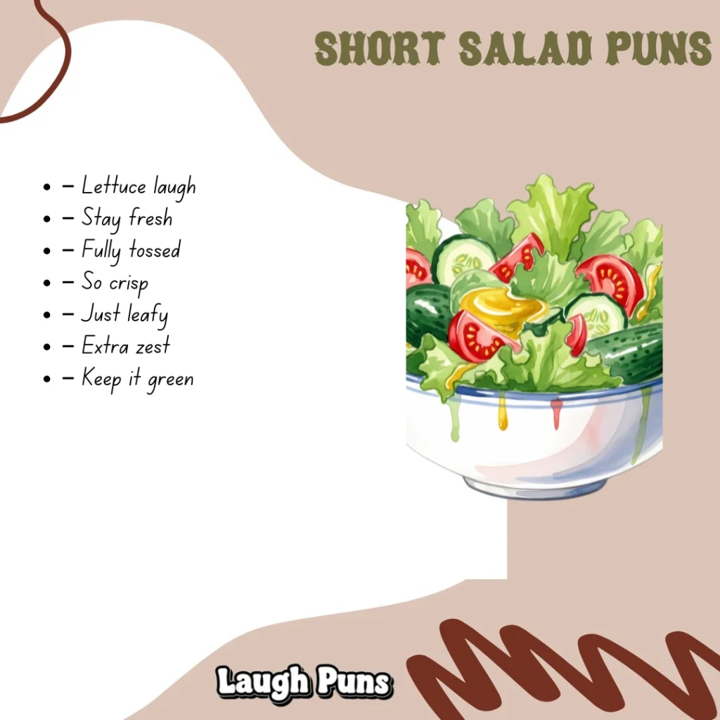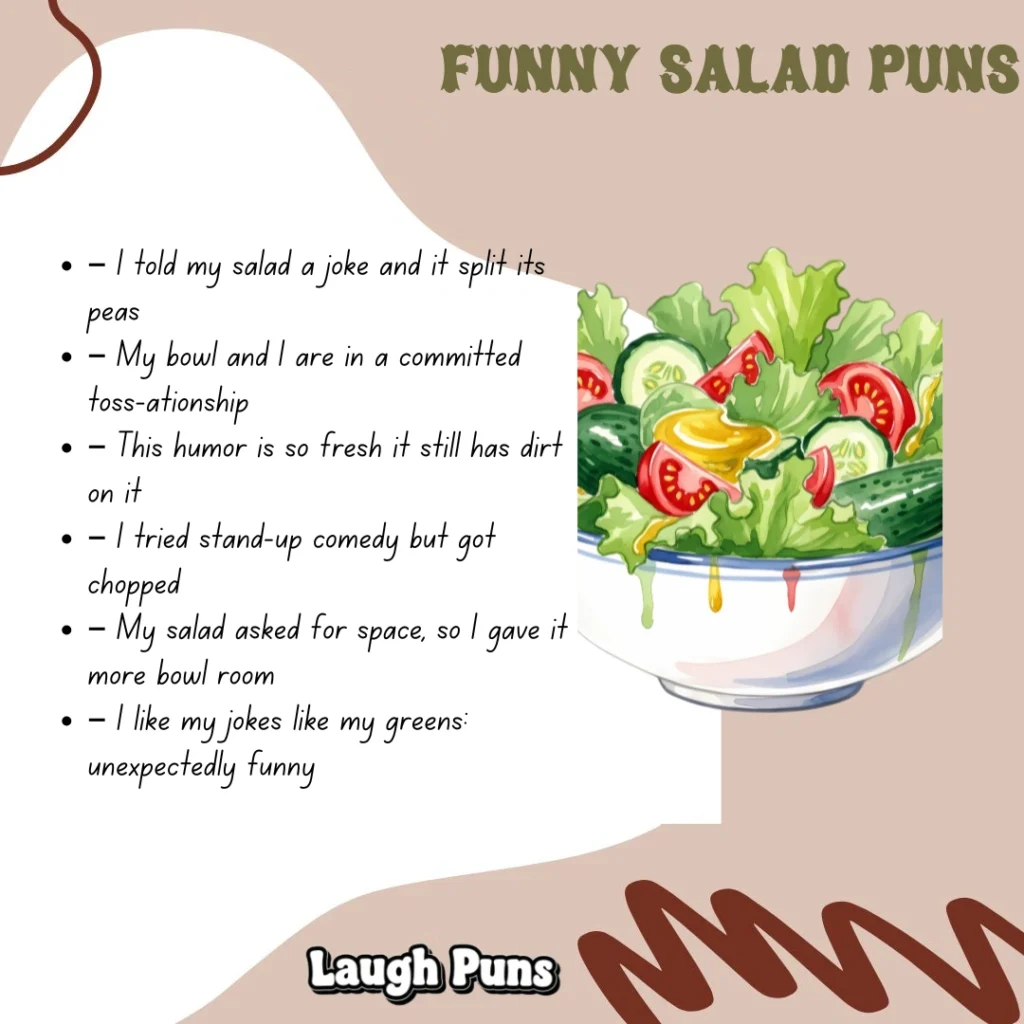 Salad puns toss together fresh ingredients and crisp humor, mixing healthy fun with playful wordwork. These puns are light, bright, and perfect for anyone who enjoys a little green-themed laughter.