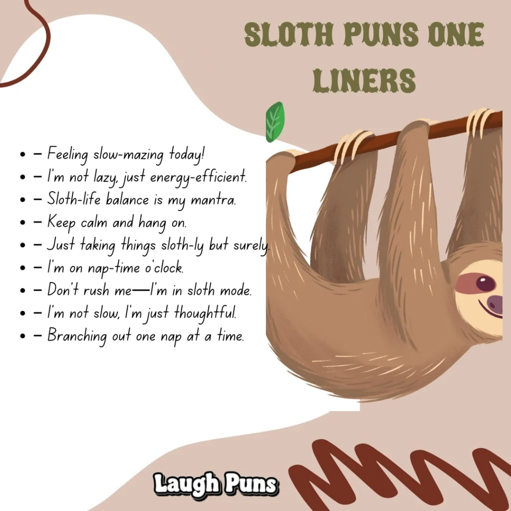 Sloth puns take their sweet time but always deliver. Soft, sleepy, and quietly funny—they remind us that the best laughs are worth the wait.