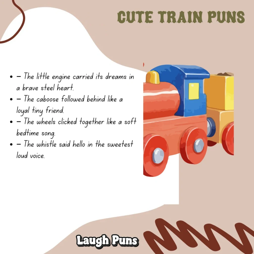 Trains keep life moving, and so does good humor. Train puns stay right on track, delivering laughs with perfect timing and full steam ahead.