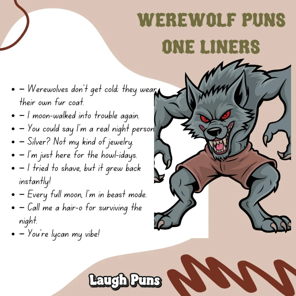Werewolf puns bite, but only with a grin. They’re sharp, witty, and howl-worthy, the kind of jokes that prove laughter runs in the pack.